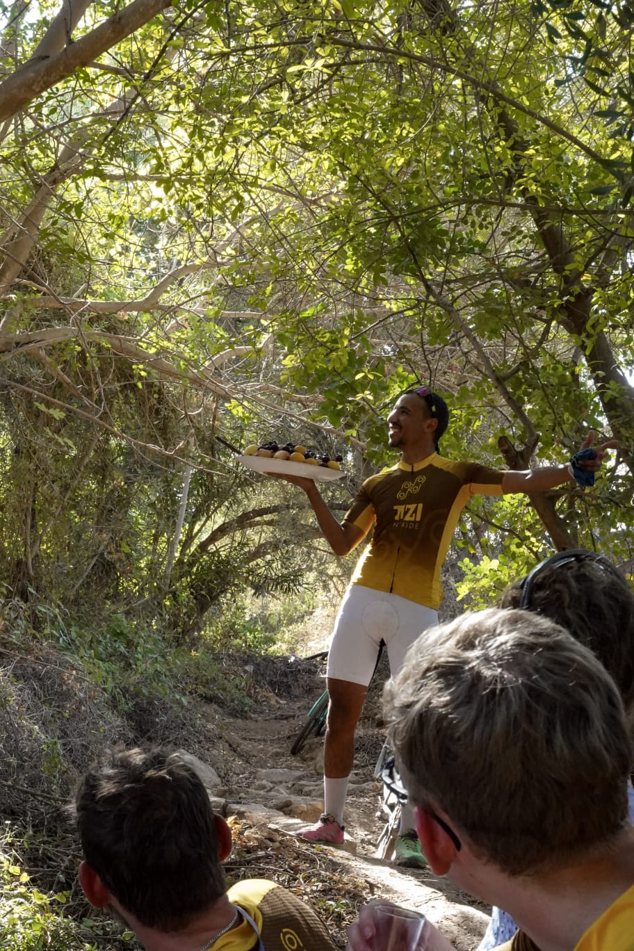 Dalej czeka nas przyjemny zjazd asfaltową drogą, wijącą się przez zieloną dolinę pełną sadów jabłkowych. Ale to nie koniec wyzwań — przed nami gravelowy podjazd o 600-metrowym przewyższeniu, na przełęcz prowadzącą do zacisznej doliny Tizi Oussem. Zjazd miejscami technicznie trudny, gravelovy. Tu odpoczywamy przy lokalnym obiedzie nad górskim strumieniem, ciesząc się smakiem i spokojem tego miejsca.
